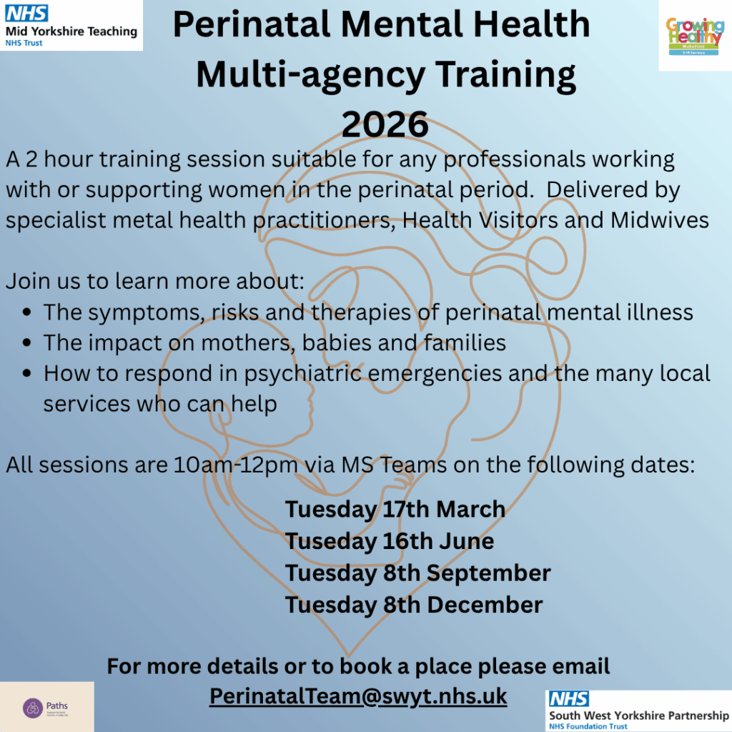 To book your place, or gather more information about this course please contact the PIMH Team by emailing PerinatalTeam@swyt.nhs.uk